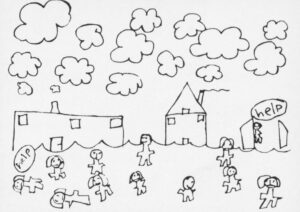 The image below is a drawing of one child’s experience during the disastrous flood, as seen in the documentary (image courtesy of Appalshop).