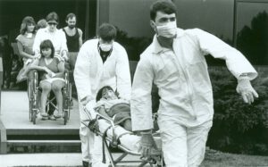 Below, medical staff transport victims of a 1985 MIC gas leak from Union Carbide’s Institute plant. MIC was the same gas that killed and injured thousands of people in Bhopal, India. Image courtesy of Appalshop.