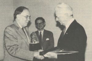Below, Board President James Rowley (left) gives the third annual Humanities Award to Senator Robert C. Byrd (right) in a Charleston ceremony as Board member Hornor Davis IV looks on. Rowley, a career educator who spent over a decade as president of the College of Graduate Studies, had just been appointed to head West Virginia’s new University System earlier in 1989.
