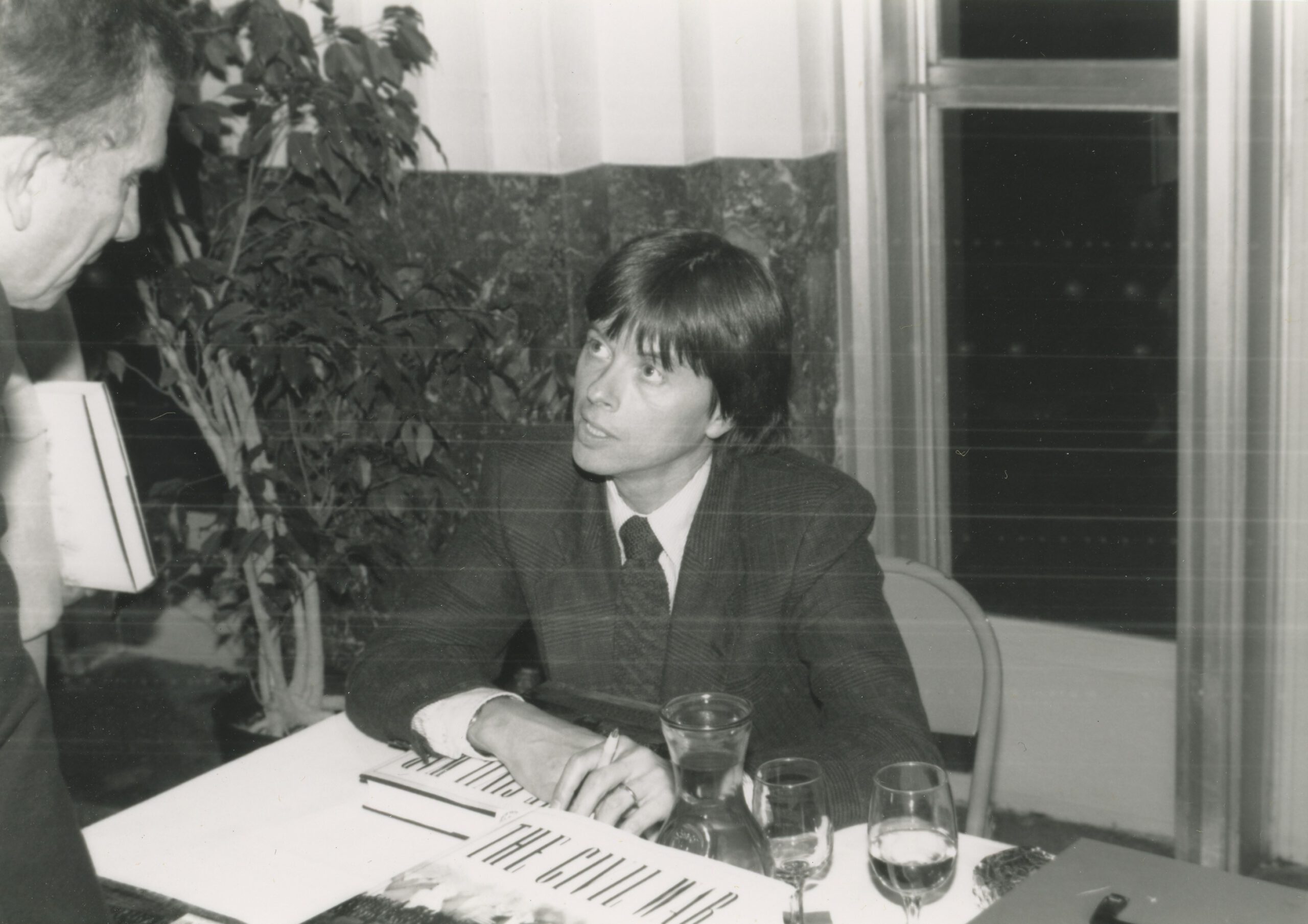 Ken Burns signs books at University of Charleston following his 1990 McCreight Lecture in the Humanities.