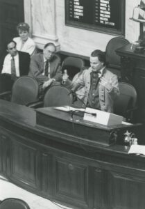 Board President James Rowley and state legislators look on as Clay Jenkinson gives his Thomas Jefferson presentation in the State Capitol in 1991.