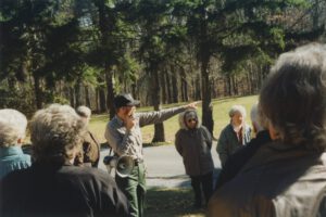 In the photo below from the 2001 bus tour, Droop Mountain Battlefield State Park Superintendent Mike Smith uses Sullivan’s bullhorn to address the tour guests.