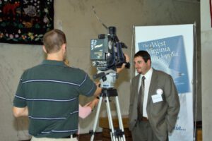 Below, historian Charles B. Keeney, a member of the West Virginia Encyclopedia staff, speaks to news cameras at the Culture Center during the Encyclopedia’s launch event.