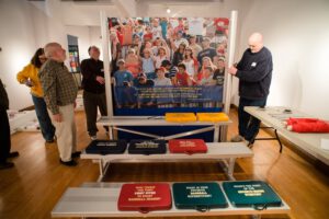 Below, volunteers set up Hometown Teams at the Parkersburg Art Center.