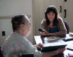 State Folklorist Emily Hilliard interviews songwriter Shirley Campbell in the Carriage House.