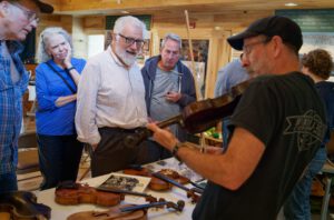 Below, fiddle repair master Chris Haddox demonstrates to an audience during the apprenticeship showcase in the Frank and Jane Gabor West Virginia Folklife Center, Fairmont State University, in September 2023.