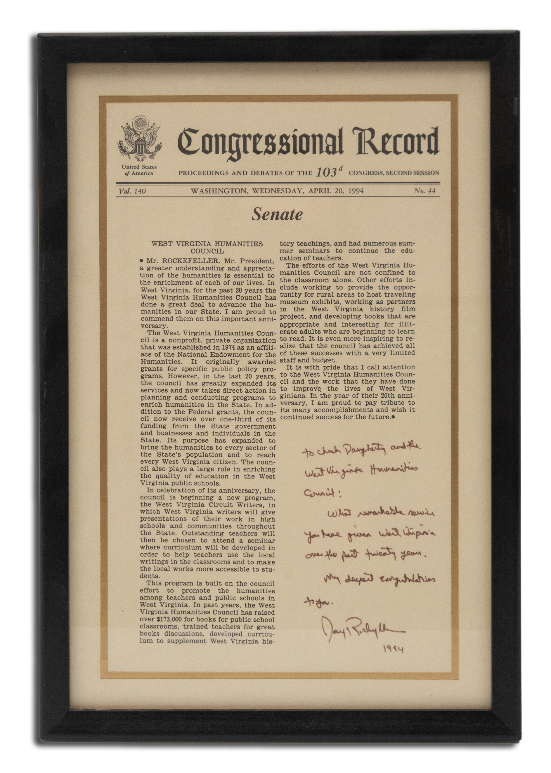 In 1994, U.S. Senator Jay Rockefeller commemorated the Council's 20th year with remarks on the Senate floor. He later sent a signed copy to Executive Director Chuck Daugherty.